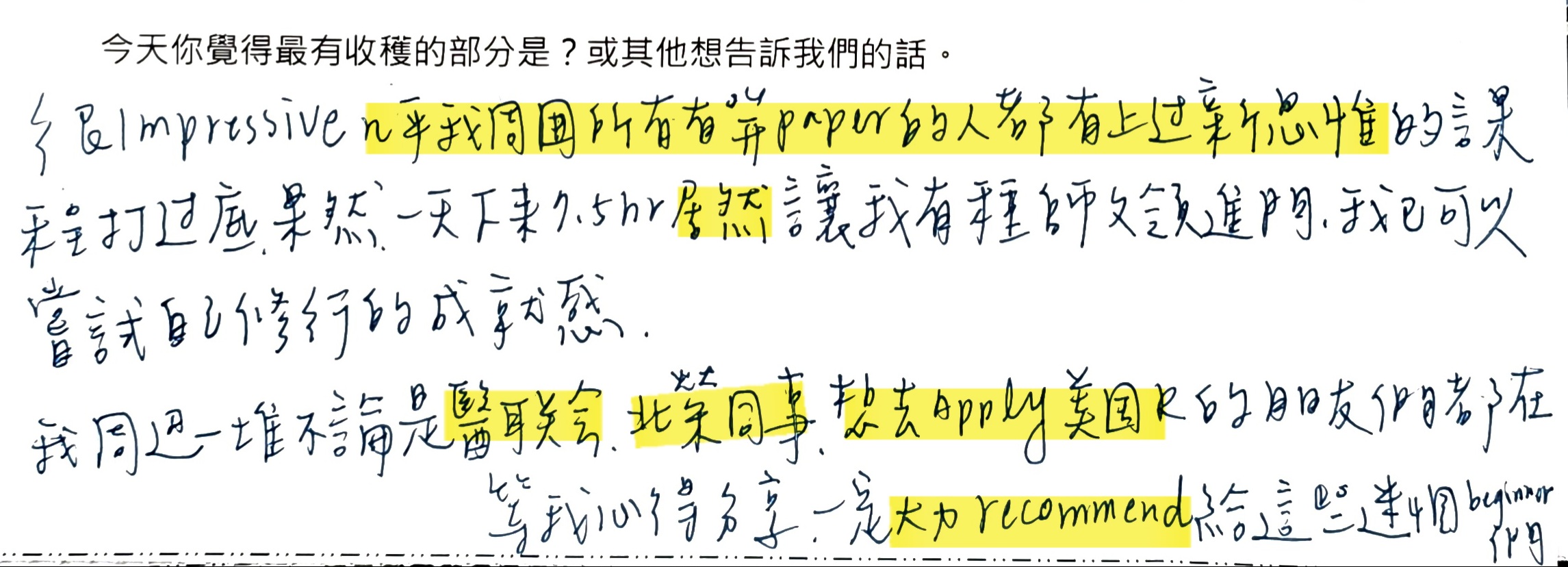 下面這張,是上課後匿名手寫的回饋,一個年輕醫師提到,「幾乎我周圍所有有發 paper 的人都有上過新思惟的課程打過底」,因為有動機、願意投入,且你實際上過,也知道我們的課程真的幫助很大。這是個不錯的篩選機制。